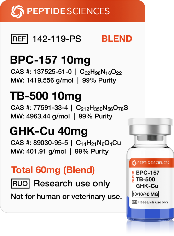BPC‑157, TB‑500, GHK‑Cu (Glow Blend) is a combination of three peptides commonly used in research for their potential regenerative, repair, and skin‑enhancing properties. BPC‑157 is a 15‑amino‑acid peptide derived from a naturally occurring gastric protein, studied in animal and laboratory models for its ability to promote tissue repair, angiogenesis (formation of new blood vessels), and modulation of inflammation. TB‑500, a synthetic fragment of thymosin beta‑4, complements this by supporting cellular migration, tissue remodeling, and connective tissue recovery. GHK‑Cu (Copper Peptide) is a tripeptide bound to copper that has been investigated for its role in stimulating collagen and elastin production, supporting skin regeneration, and providing antioxidant and anti-inflammatory effects. Together, these peptides are often combined in topical or injectable “Glow Blends” for experimental use in improving tissue healing, reducing inflammation, and promoting skin health and overall regenerative potential, based primarily on preclinical studies.