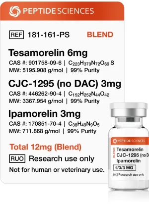 Tesamorelin, CJC-1295 (no DAC), and Ipamorelin 12mg (blend) is a combination of peptides designed to naturally stimulate growth hormone production in the body. Tesamorelin is a synthetic growth hormone–releasing hormone (GHRH) analog that signals the pituitary gland to release growth hormone in a pulsatile and physiologically regulated manner. CJC-1295 (no DAC) is another GHRH analog that promotes growth hormone secretion but without the long-acting drug affinity complex (DAC), allowing for shorter, controlled pulses. Ipamorelin is a selective growth hormone–releasing peptide (GHRP) that acts on ghrelin receptors to further enhance growth hormone output while minimizing effects on cortisol and prolactin. When combined in a 12mg formulation, these peptides work synergistically to optimize endogenous growth hormone release, supporting recovery, metabolism, and tissue regeneration.